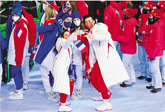 2月20日晚,中国代表团成员王诗玥(前左)柳鑫宇(前右)在北京冬奥会闭幕式上与法国代表团成员合影。 新华社发