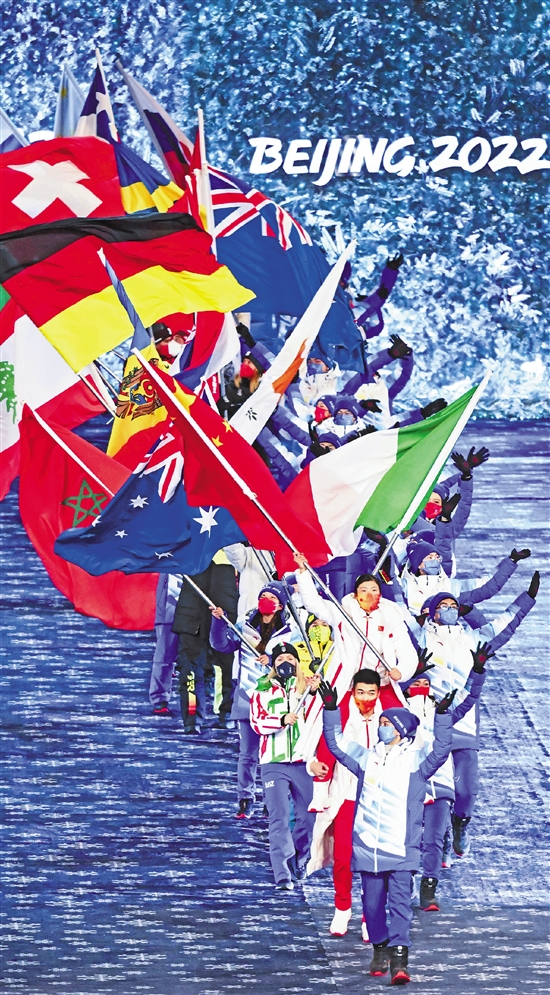 2月20日晚,北京第二十四届冬季奥林匹克运动会闭幕式在国家体育场举行。这是代表团旗帜和运动员入场环节。 新华社记者 李尕 摄