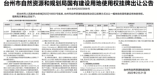 经台州市人民政府台供地[2022]10003号批准,台州市自然资源和规划局决定以挂牌方式出让一幅地块的国有建设用地使用权。现将有关事项公告如下: