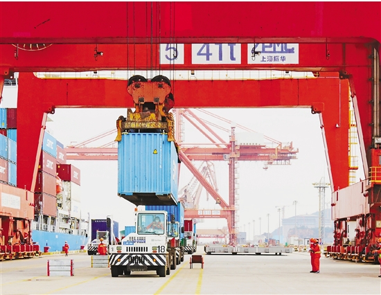 温州港状元岙港区桥吊将集装箱从集卡装卸至船舶上 拍友 王海燕 摄