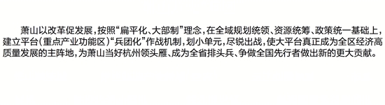 萧山以改革促发展,按照“扁平化、大部制”理念,在全域规划统领、资源统筹、政策统一基础上,建立平台(重点产业功能区)“兵团化”作战机制,划小单元,尽锐出战,使大平台真正成为全区经济高质量发展的主阵地,为萧山当好杭州领头雁、成为全省排头兵、争做全国先行者做出新的更大贡献。