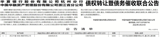 中国华融资产管理股份有限公司浙江省分公司作为上述债权的受让方,现公告要求公告清单中所列包括但不限于债务人、担保人及其清算业务人等其他相关当事人,从公告之日起立即向中国华融资产管理股份有限公司浙江省分公司履行主债权合同及担保合同约定的还本付息义务或相应的担保责任(若借款人、担保人因各种原因发生更名、改制、歇业、吊销营业执照或丧失民事主体资格等情形,请相关承债主体、清算主体代为履行义务或承担清算责任)。