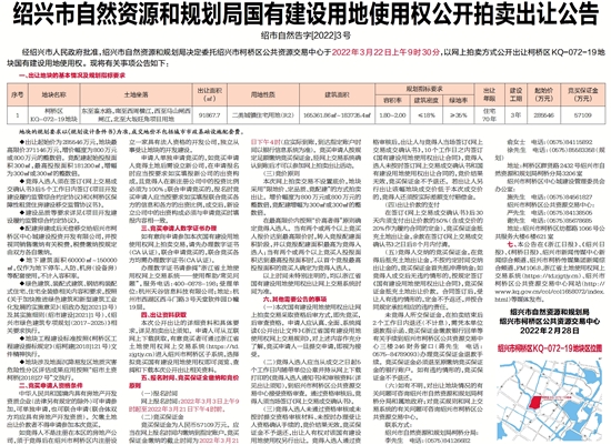 经绍兴市人民政府批准,绍兴市自然资源和规划局决定委托绍兴市柯桥区公共资源交易中心于2022年3月22日上午9时30分,以网上拍卖方式公开出让柯桥区KQ-072-19地块国有建设用地使用权。现将有关事项公告如下: