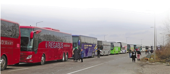2月27日,在乌克兰克拉科韦茨,车辆排队等待前往波兰方向。新华社发