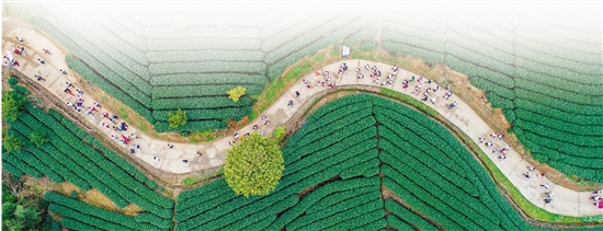 团队游客在杭州市富阳区拔山村万亩茶山游览。 新华社记者 徐昱 摄