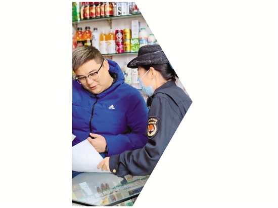 金华市婺城区综合行政执法局执法队员向商户宣传反诈小知识。 拍友 钱含情 摄