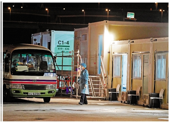 3月1日,新冠肺炎确诊患者抵达青衣方舱医院。当日晚7时,中央援建香港的青衣方舱医院正式交由香港特区政府营运,并接收首批无症状或轻症新冠肺炎确诊患者。 新华社记者 吕小炜 摄