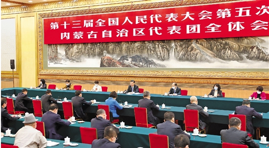 3月5日,中共中央总书记、国家主席、中央军委主席习近平参加十三届全国人大五次会议内蒙古代表团的审议。 新华社记者 黄敬文 摄