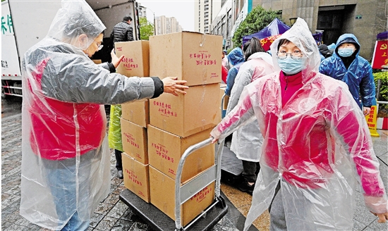 3月6日下午,杭州市上城区望江街道婺江三园,社区干部和志愿者冒雨搬运生活物资,赶在晚饭前送到居民手中。 本报记者 董旭明 摄
