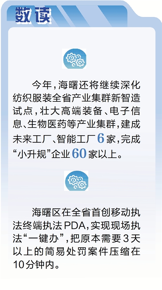 今年,海曙还将继续深化纺织服装全省产业集群新智造试点,壮大高端装备、电子信息、生物医药等产业集群,建成未来工厂、智能工厂6家,完成“小升规”企业60家以上。
