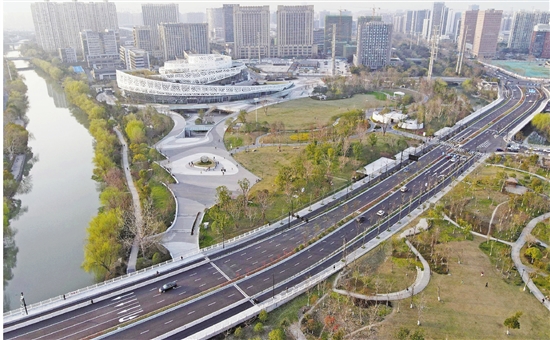 3月9日,沪杭甬高速杭州市区段改建工程北段、萍水东街(莫干山路—桥弄街)、听胜弄(东新路—长浜路)、龙腾街(拱康路—石前港)等4条道路开通,杭州城北的通行条件进一步得到改善。图为刚开通的萍水东街穿过运河中央公园向东北方向延伸。