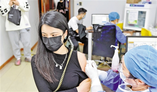 3月13日,在杭州市西湖区西溪街道临时疫苗接种点,市民正在有序接种新冠疫苗。
