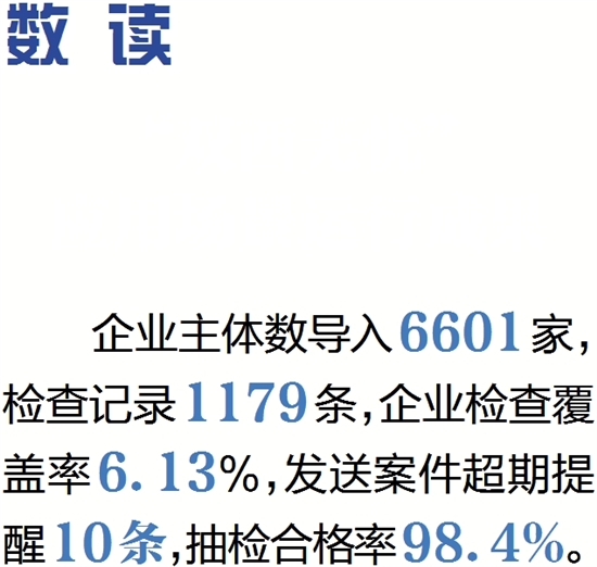 企业主体数导入6601家,检查记录1179条,企业检查覆盖率6.13%,发送案件超期提醒10条,抽检合格率98.4%。