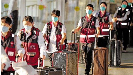 3月14日傍晚,应香港特区政府请求,由广东省组派的内地援港医疗队共75人,经深圳湾口岸抵达香港。 新华社发