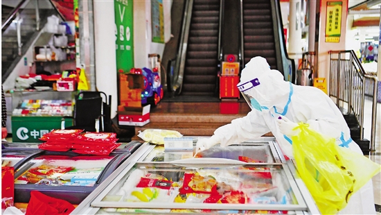 3月13日起,杭州市临安区对全区重点场所开展环境核酸检测。图为3月14日,医务人员在该区某农贸市场对冰柜等进行核酸采样。 拍友 胡建强 摄