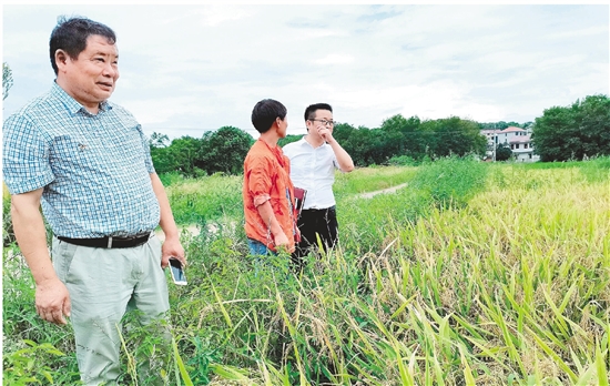 省农信担保公司及兰溪办事处工作人员查看种粮大户承租田里的水稻生长情况(资料照片) 陈进进 摄