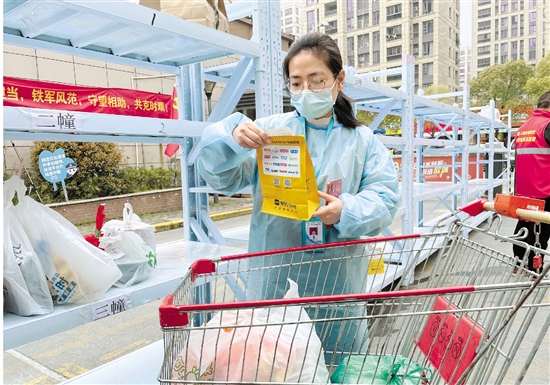 毛毛为封控区居民配送外卖包裹。 本报记者 周逸 摄