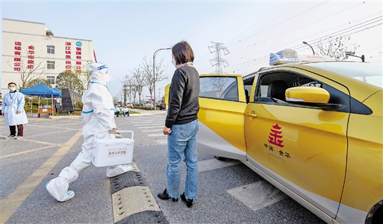 这几天,在金华市金东区东孝街道,一批又一批司机配合工作人员争分夺秒转运核酸检测样本。这些司机来自金华的一家出租车公司。图为3月19日,在东孝街道的一个核酸检测点,“的姐”方秋丹在转运核酸检测样本。 拍友 胡肖飞 摄 |