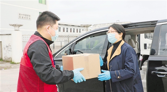龙游县民政局工作人员将药品送到衢江区全旺镇工作人员手中。拍友 吴森邦 摄