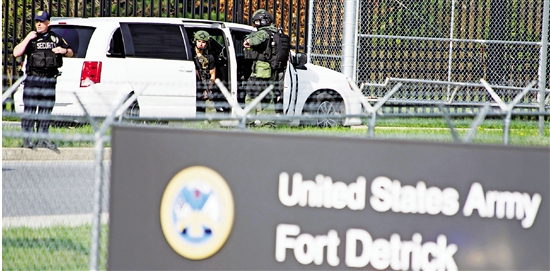 特警人员准备进入美国马里兰州弗雷德里克市的德特里克堡军事基地。德特里克堡在上世纪中叶是美国生物武器计划研发中心,目前是美国陆军医学研究与发展司令部和美国陆军传染病医学研究所所在地。(资料照片) 新华社发