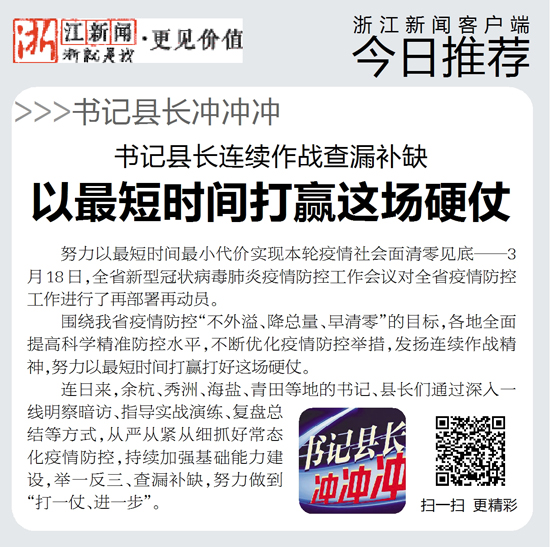 连日来,余杭、秀洲、海盐、青田等地的书记、县长们通过深入一线明察暗访、指导实战演练、复盘总结等方式,从严从紧从细抓好常态化疫情防控,持续加强基础能力建设,举一反三、查漏补缺,努力做到“打一仗、进一步”。