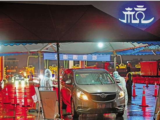 3月20日晚,风雨交加,在沪杭高速杭州宣家埠入城口,疫情防控工作人员对中高风险地区来杭人员登记信息,查验健康码、行程卡、核酸检测报告,守好杭城东大门。