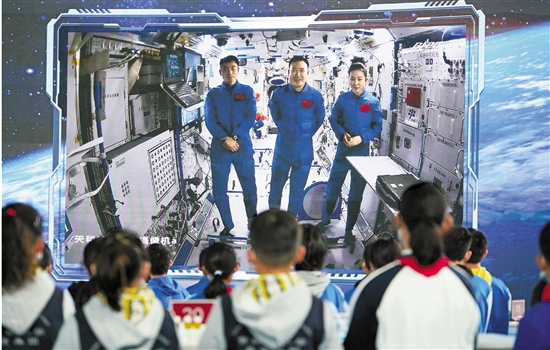 3月23日,“天宫课堂”第二课开讲,神舟十三号飞行乘组航天员翟志刚(中)、王亚平(右)、叶光富在中国空间站进行太空授课。 新华社发(时旭琛 摄)