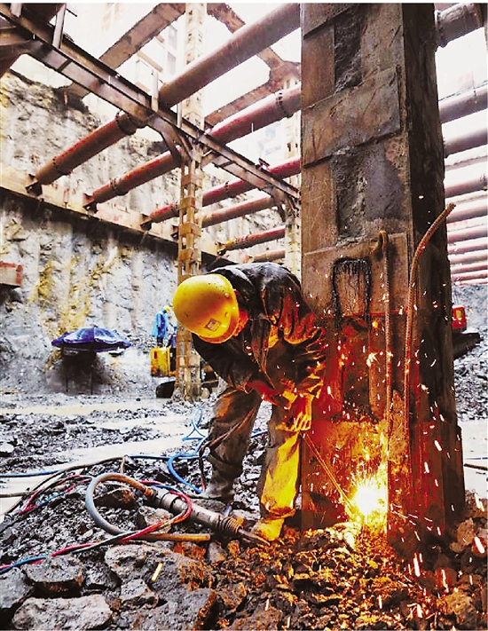 东西向快速通道下穿杭徽高速项目施工现场,工人们在基坑内作业。