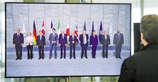 3月24日,在比利时布鲁塞尔的北约总部,一名男子观看屏幕上领导人出席七国集团峰会合影仪式的画面。 新华社记者 郑焕松 摄