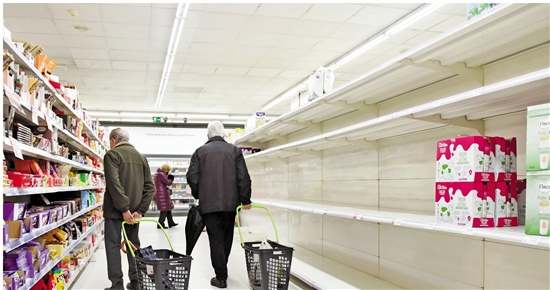 3月23日,人们走过西班牙卡塞雷斯一家超市内空荡荡的奶制品货架。燃油价格上涨已经影响到西班牙部分商品的市场供应。 新华社发