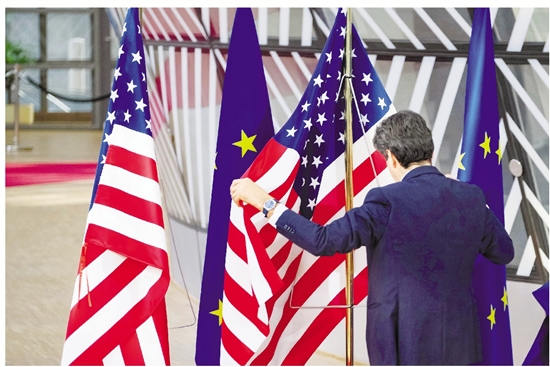 3月24日,工作人员在比利时布鲁塞尔的欧盟总部整理美国国旗。 新华社发