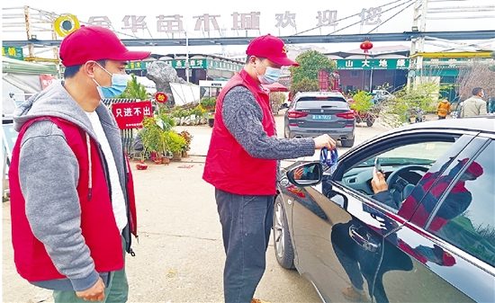 金东区澧浦镇志愿者在苗木市场门口检查出入人员健康码和行程码。王劲俏 摄