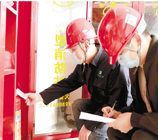 3月28日,国网桐乡市供电公司纪检派驻员检查营业厅消防设备安全使用期限。 徐添羽 摄