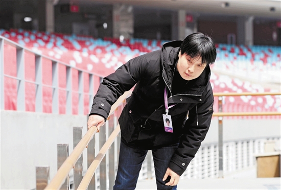 郑雄鹰正在查看亚运场馆内的无障碍通道设施。 本报记者 孙金满 摄