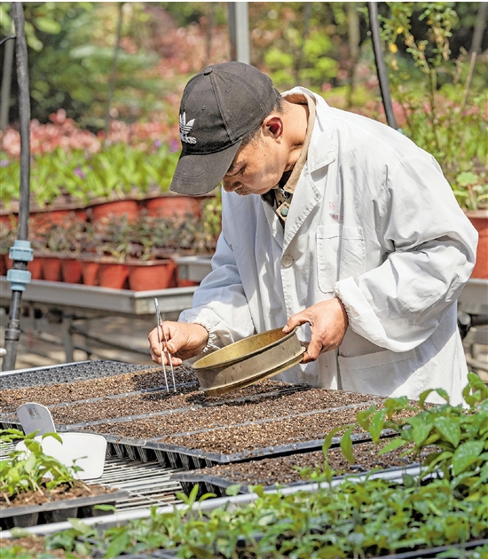 工作人员用镊子轻轻地夹起黄精种子,一粒一粒放入穴盆中。 拍友 黄水福 摄