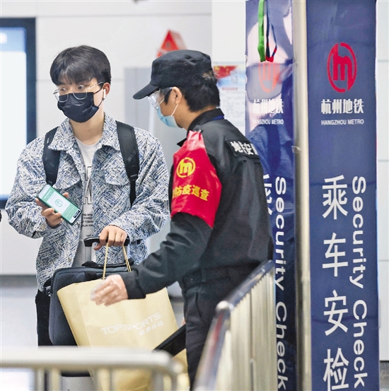 4月6日,杭州地铁2号线中河北路站,乘客在出示行程卡。根据最新防疫要求,在核验健康码的同时,乘客须出示行程卡方可入站乘车。 本报记者 王建龙 摄