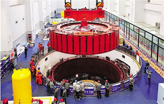 | 4月7日上午,省内第二大常规水力发电站——浙能滩坑水电站内,重达450吨的1号机组大修转子回装在发电机坑内。该转子的吊装成功,为机组在梅雨季前重新投入运行创造了条件。 通讯员 朱将云 张翔 本报记者 张帆 摄 |