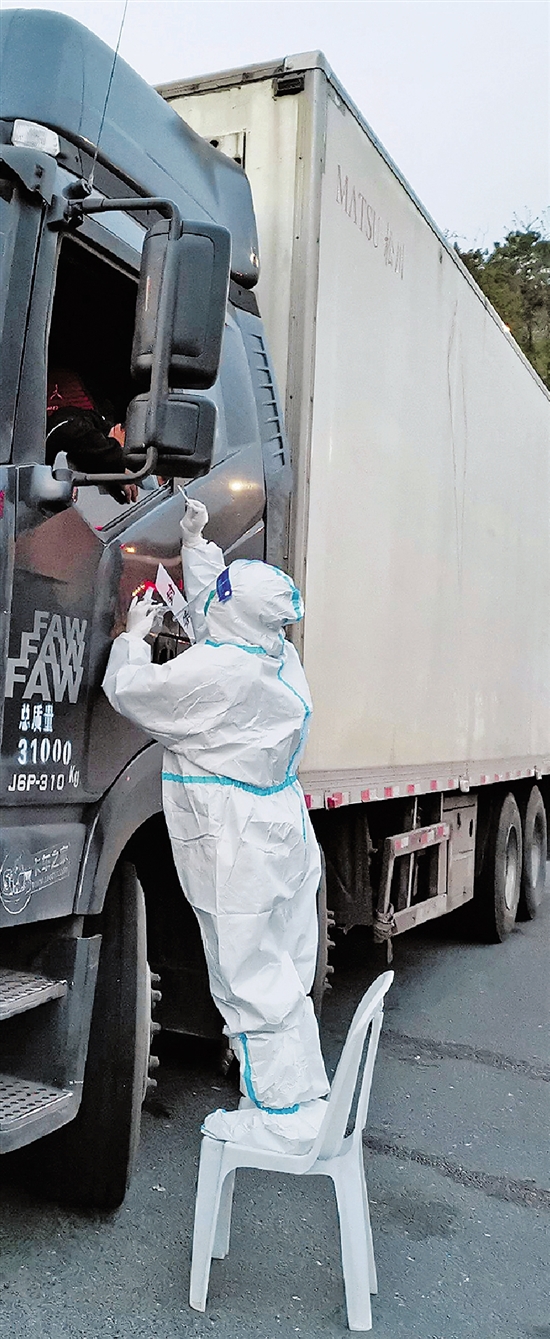 4月6日晚,在G56高速杭州市临安区天目山镇藻溪出口,工作人员坚守一线开展车辆、人员核验工作。