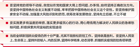 ■ 要坚持党的领导不动摇,自觉站在党和国家大局上想问题、办事情,始终坚持正确政治方向。要坚持中国特色社会主义制度不动摇,牢牢把握中国特色社会主义这个定性。要坚持维护国家安全不动摇,加强重大风险识别和防范,统筹改革发展稳定,坚持先立后破、不立不破