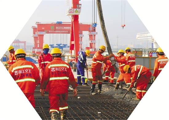 杭甬复线宁波一期项目施工人员正在进行混凝土浇筑作业