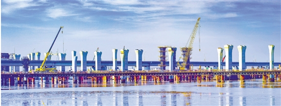 正在建设中的杭甬复线宁波一期项目滨海互通栈桥