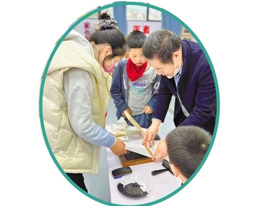 ➝ 杭州凤凰小学学生跟着民间艺术家体验印刷术。 凤凰小学供图