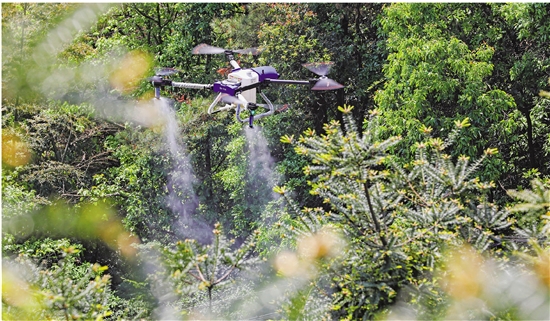 近日,在海拔600米的嵊州市谷来镇培坑村想食榧榧香榧种植基地,两架载有配制香榧授粉液的农业植保无人机腾空而起,在种满香榧树的山坡上盘旋喷洒。无人机喷洒授粉精准均匀,有助于节约劳动成本,提高榧果产量。