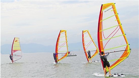 4月26日,玉环市漩门湾三期帆船帆板训练中心,来自杭州、温州、台州的多支帆船帆板队伍抓紧训练,实地备战浙江省第17届运动会。