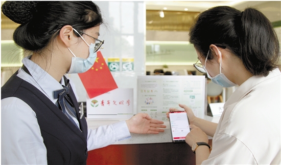 邮储银行温州市分行大堂经理向客户介绍数字人民币相关内容,并指导客户在邮乐网支付使用。
