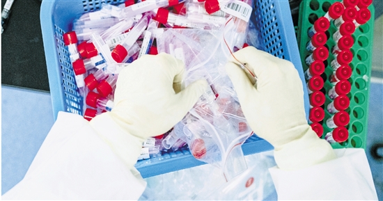 样本处理区的检测人员通过传递窗接收外来样本并拆袋。