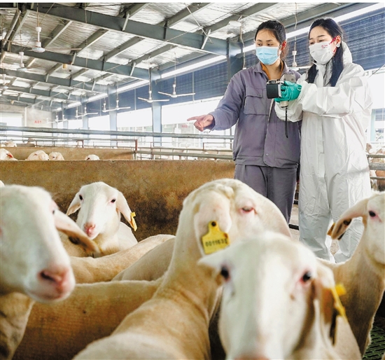 记者(右一)用手持终端设备扫描湖羊耳标 通讯员 吴拯 摄