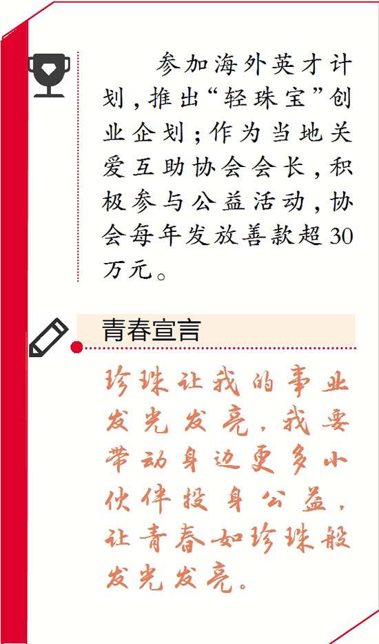 珍珠让我的事业发光发亮,我要带动身边更多小伙伴投身公益,让青春如珍珠般发光发亮。