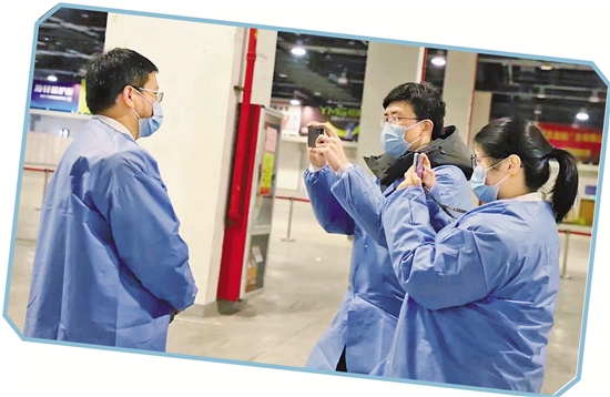 今年1月,永康突发疫情,金华分社记者沈超(中)和共享联盟金华中心站记者一起在永康国际会展中心,采访火速投入使用的气膜方舱实验室。