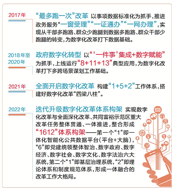 迭代升级数字化改革体系构架 实现数字化改革与全面深化改革、共同富裕示范区重大改革任务整体贯通、一体推进,整合形成“1612”体系构架——第一个“1”即一体化智能化公共数据平台(平台+大脑),“6”即党建统领整体智治、数字政府、数字经济、数字社会、数字文化、数字法治六大系统,第二个“1”即基层治理系统,“2”即理论体系和制度规范体系,形成一体融合的改革工作大格局。